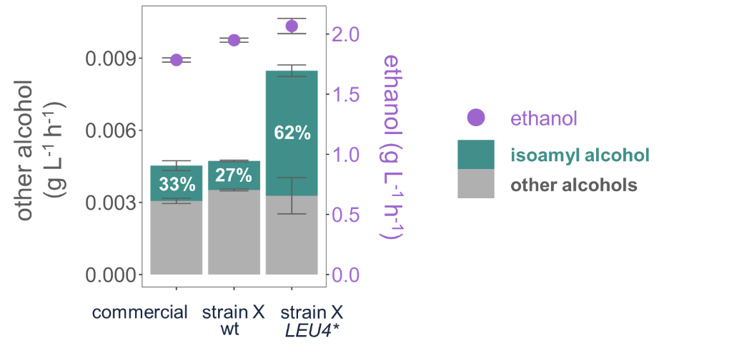 So, we introduced a single nucleotide change in the LEU4 and ILV6 genes that alters the inhibition site of leucine and valine – no more stop sign, in other words. This strategy resulted in five times more isoamyl alcohol produced, and an increase from 30% to 65% of purity within the waste alcohol stream. Also, ethanol production has even improved.