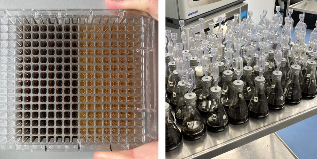 In the Verstrepen lab, we have more than 1,000 S. cerevisiae strains isolated from different industries, such as beer, wine, bioethanol, bread, and spirits. Using this collection, we searched for strains that can grow in sugarcane molasses, a feedstock for bioethanol production. This experiment was done on a micro-liter scale, using plates containing hundreds of wells to allow fast screening. The top candidates were then tested in flasks for ethanol production yield. We found five strains performing better than the standard commercial bioethanol strain!