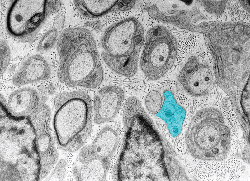 In demyelinating forms, mutated genes affect proteins related to the myelin sheath. In these cases, the myelin sheath won't be as functional as in healthy patients, which can lead to problems with nerve conduction. Think of it as a cable connecting your television to the socket, where the cable's protective rubber covering helps transmit electrical input faster and more safely. If this rubber sheath is affected, the transmission will not work as well. The same principle applies in CMT, where patients' peripheral axons are not as myelinated as in healthy controls.