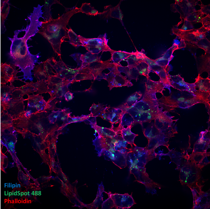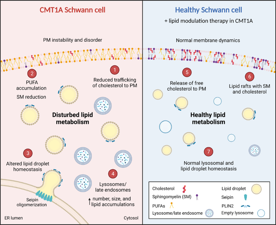 Using the Schwann cell models that Robert helped to create, we found that cholesterol and lipid metabolism are the most dysregulated pathways in these CMT-derived cells, and that characterize early pathological alterations in the disease. Specifically, we detected impairments in lipid storage and transport to the plasma membrane, which also means an alteration in the plasma membrane organization. Normally, cholesterol and specific lipids are nicely organized in 'lipid rafts', where they favor protein interactions and signaling events. Schwann cell’s lipid rafts are particularly enriched in proteins that characterize the peripheral myelin. If the correct organization of membrane lipids is sub-optimal, signaling from the membrane is affected, and as a result Schwann cells won't be able to function as well as in people without CMT. You can read the pre-print in BioRxiv.